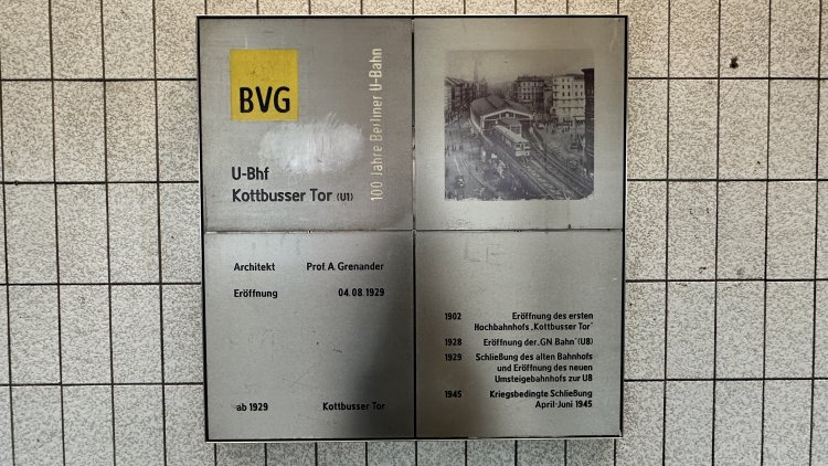 İstasyonda yer alan bilgilendirme panosu, 1902’de açılan ilk yüksek hat istasyonundan bugüne uzanan tarihsel gelişimi özetliyor. Prof. Alfred Grenander tarafından tasarlanan ve 4 Ağustos 1929’da hizmete giren yeni istasyon, Berlin U-Bahn tarihinin önemli dönemeçlerinden biri olarak kabul ediliyor. 1928’de U8 hattının (o dönem “GN Bahn”) eklenmesi ve 1929’da eski istasyonun kapatılarak yeni aktarma merkezinin devreye alınması, Kottbusser Tor’u şehrin ulaşım entegrasyonunda stratejik bir noktaya dönüştürdü.