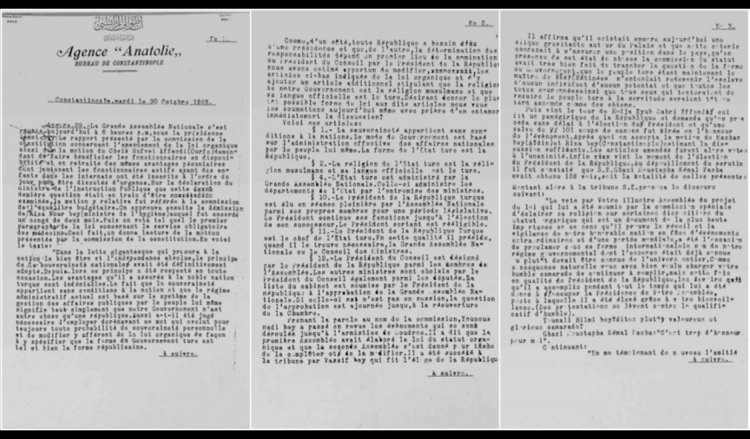 “Türkiye Büyük Millet Meclisi, dün gece aldığı kararla Cumhuriyet idaresini kabul etti. Mustafa Kemal Paşa, Türkiye Cumhuriyeti’nin ilk Cumhurbaşkanı seçildi.”
