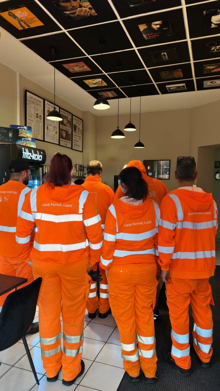 Neukölln’de BSR sokak temizlik ekibi,Almanya federal vekil Hakan Demir ile Rollbergkiez’deki Cafe Altenbraker önünde sabah vardiyasına kısa bir kahve molası verdiler.foto:Mustafa Ekşi