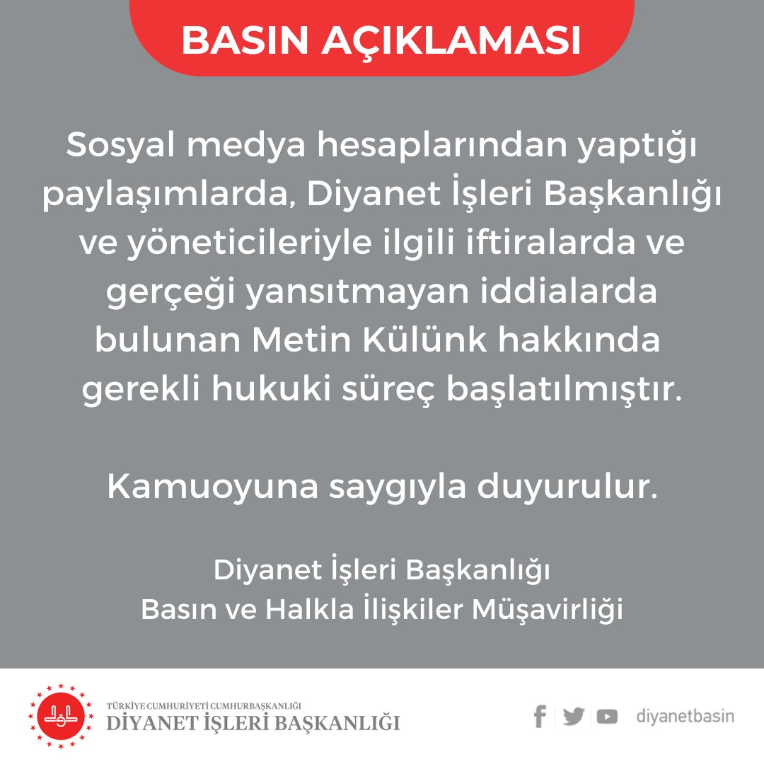 Sosyal medya hesaplarından yaptığı paylaşımlarda, Diyanet İşleri Başkanlığı ve yöneticileriyle ilgili iftiralarda ve gerçeği yansıtmayan iddialarda bulunan Metin Külünk hakkında gerekli hukuki süreç başlatılmıştır.